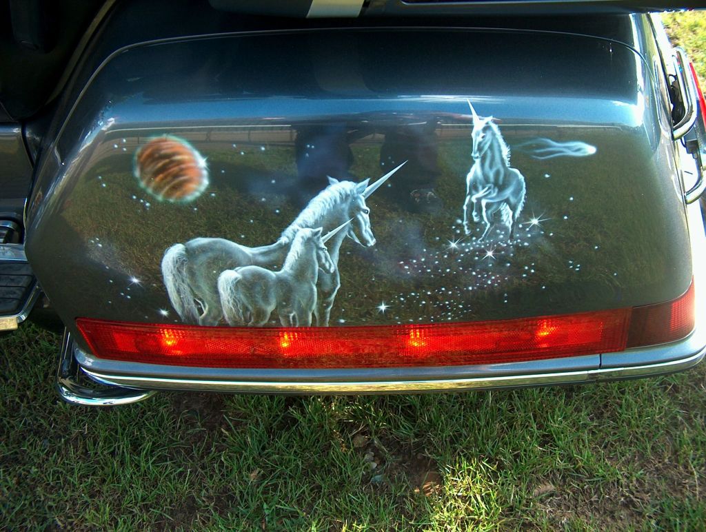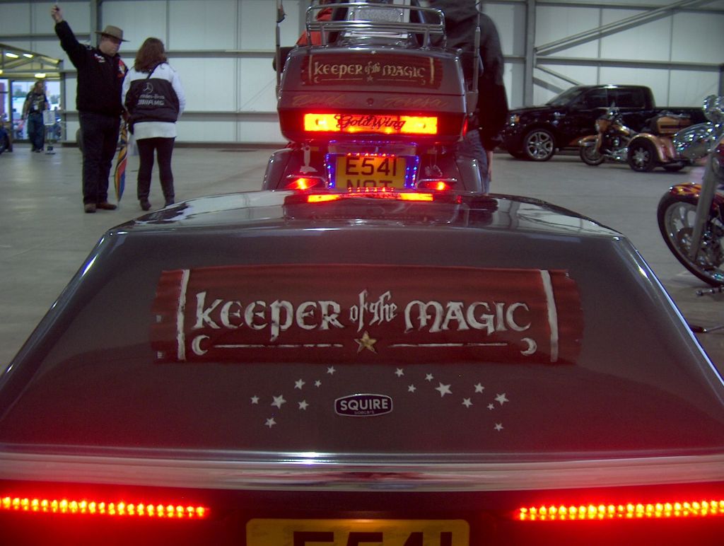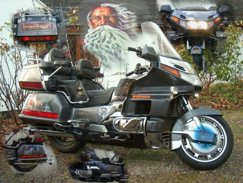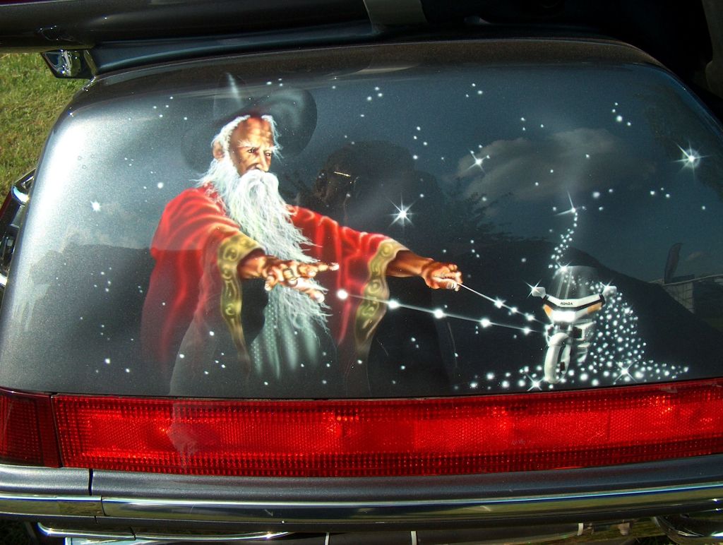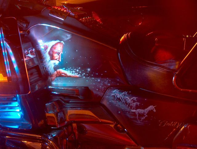 At this point I was nearly standard having only a chrome top box rack which I have to this day 25 years on and still nice and shiny (take note Kuryakyn) , also Drivers backrest so fairly naked in dressed Goldwing terms. Derek not being blessed financially always seemed to find finances to treat me, as I was fairly standard he wanted to have me dressed to impress and decided that I was to have some plastic surgery enhancements to improve my looks. I was booked in to a top guy who would take the necessary steps to get me noticed. Dave Nicholls from Bournemouth was an Airbrush artist and had agreed to give me a makeover. My theme was to be white magic and the main character was a wizard “The Elder” by Myles Pinkney. Dave then created a design around this incorporating the wizard conjuring up myself (Keeper of the Magic) within a bubble and then bursting into life along one side. On the other the Wizard blowing magic dust creating unicorns that come to graze on the rear pannier all finished of with a picture of a book binder on my top box with my name “Keeper of the Magic” in Gold Leaf and to the front fender a detailed facial image of the elder. My artwork is carried on further to my trailer with an incredible airbrush picture of the Elder wizard on its lid but with Silver leaf on the rear book binder I was away for 7 weeks having this work completed.