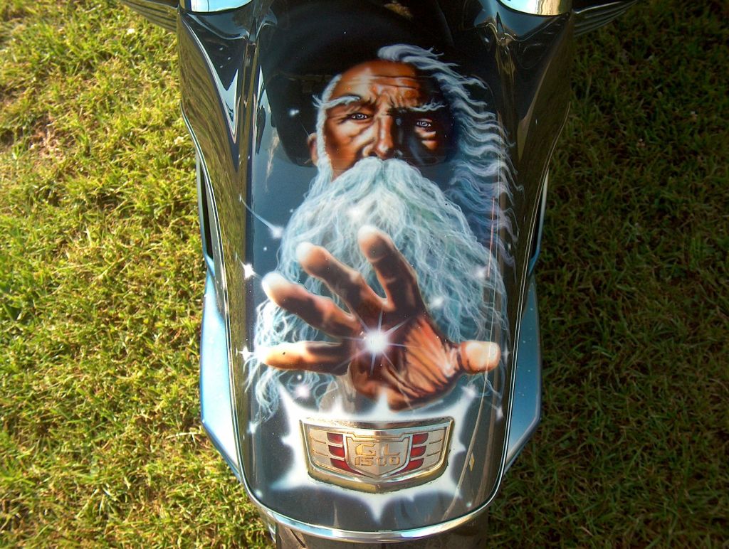 Many other high quality images are air brushed beautifully around the bike. The rear of the bike is wearing its name in gold leaf on a book binder which has a very high impact when the sun hits on it.